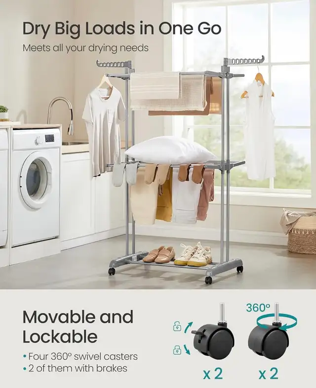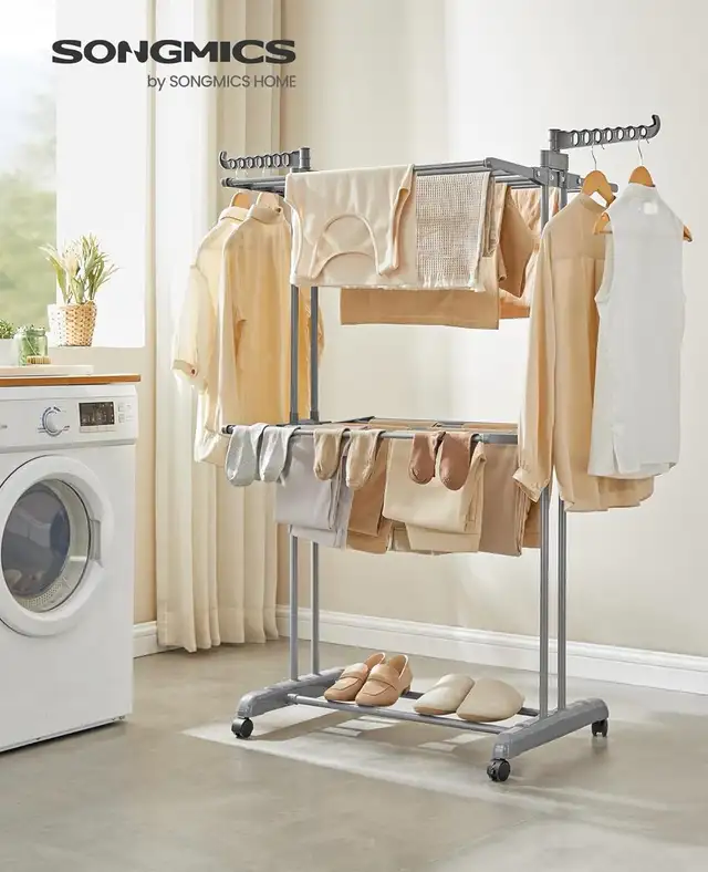 Make laundry day easier with this SONGMICS 3-tier clothes drying rack. Designed with multiple drying levels, rotating wings, and a bottom shelf for shoes, it offers plenty of space for clothing, towels, and blankets. Built with durable stainless steel and smooth-rolling wheels, this rack provides flexible drying wherever you need it.