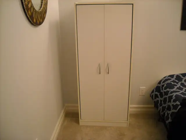 WHITE STORAGE CABINET WITH ADJUSTIBLE SHELVES. MEASURES: 591/4'' TALL. 25'' WIDE. 11 1/2'' DEEP. ASKING $20.00 O.B.O. PRICED RIGHT FOR A QUICK SALE.