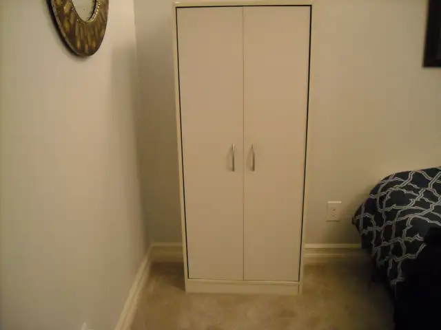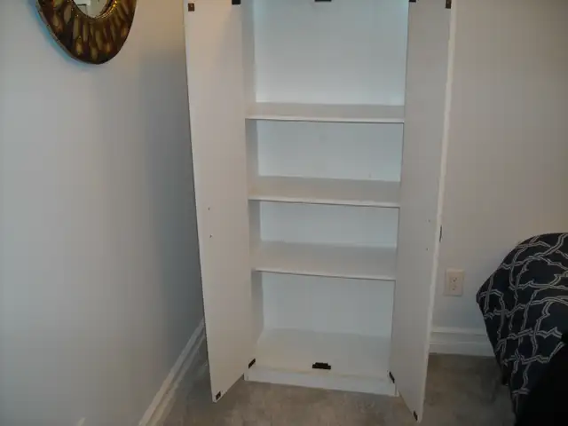 WHITE STORAGE CABINET WITH ADJUSTIBLE SHELVES. MEASURES: 591/4'' TALL. 25'' WIDE. 11 1/2'' DEEP. ASKING $20.00 O.B.O. PRICED RIGHT FOR A QUICK SALE.