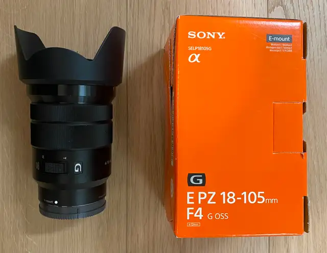 For sale is a Sony EPZ 18-105 mm E-Mount G Lens, lens hood, lens caps, and paperwork, all in as-new condition and in the original box. The lens is in excellent physical condition and full working order with front and rear elements that are clean and scratch-free. I've included a lens blower so you can keep them that way!