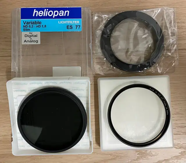 Also included in the package is a Heliopan variable ND filter — a truly exceptional (and expensive) filter — and a B W UV Haze filter. I have also included step/up step down rings.