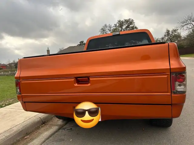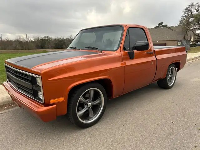 1984 Square-body Silverado , third gen pick-up. Unique features "Mango Tango" colored paint, custom rear roll pan , shaved drip moldings and LED lights.