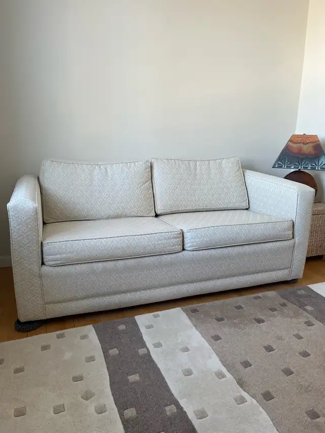 Moving sale. Beautiful light colored with blue fleck material. Very good condition. 69 “ L x 34 “ W x 31 “ h. Comfortable mattress with cover. Used for guests so there has very little use. Looks and is great. $200 obo. Call text 204 471 6703 or gndgray@mts.net