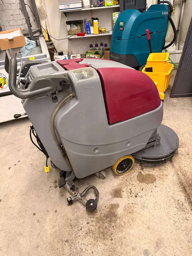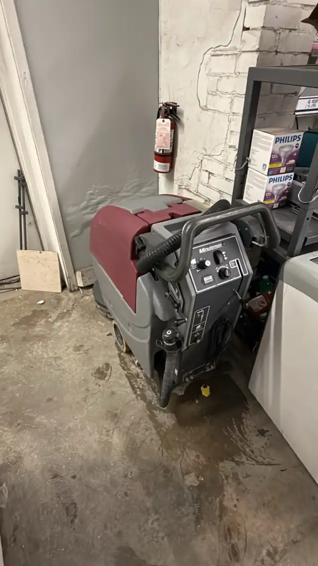 This machine scrubs floors and vacuums dirty water in one pass, leaving floors clean and nearly dry.