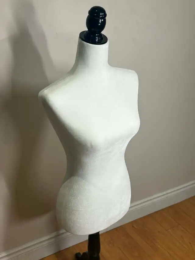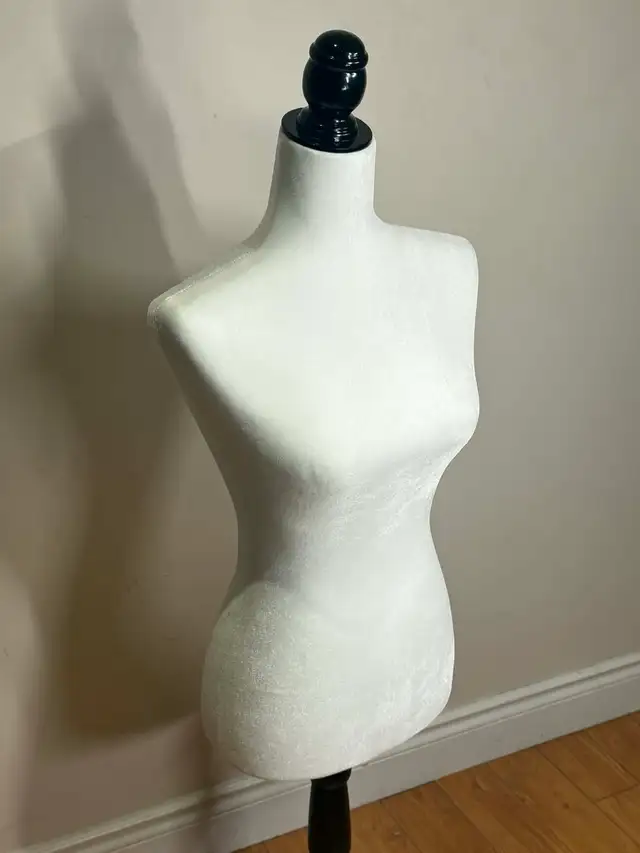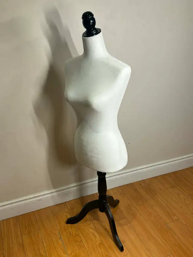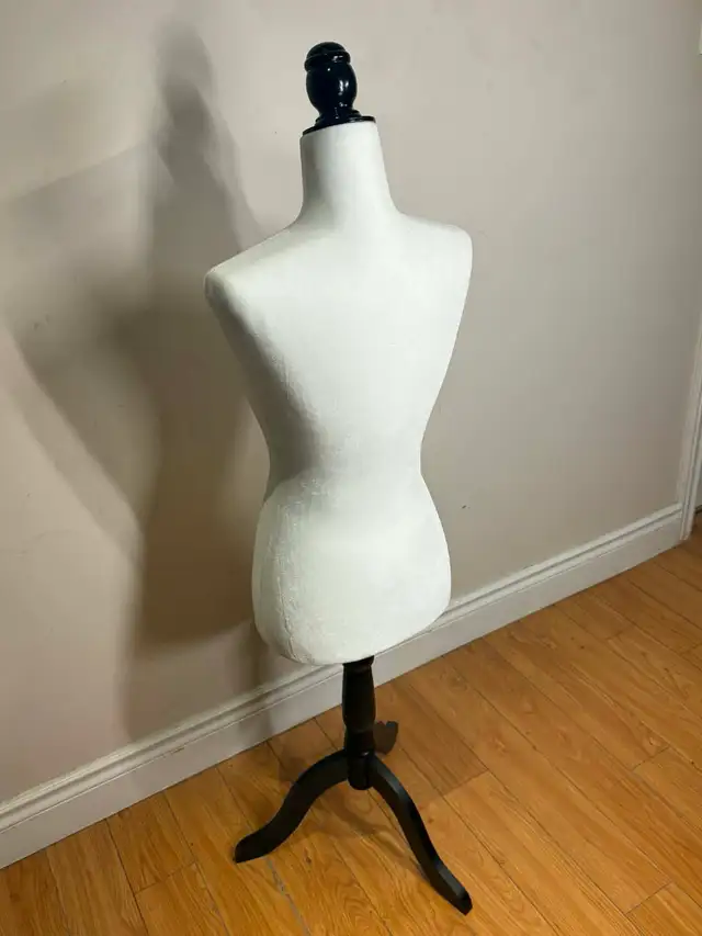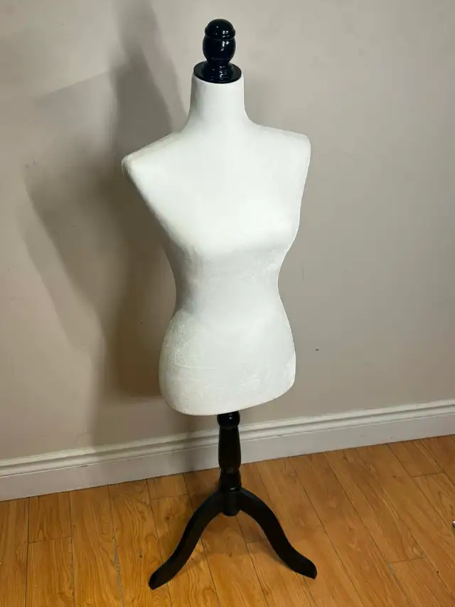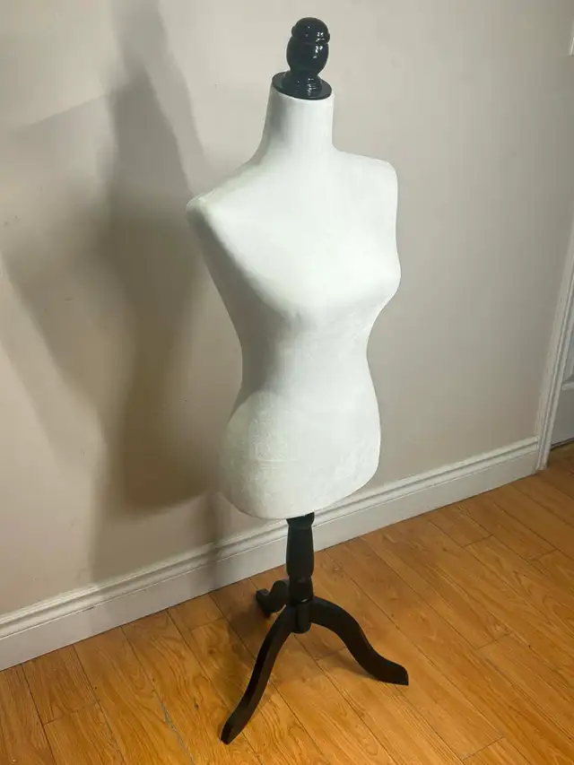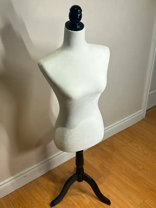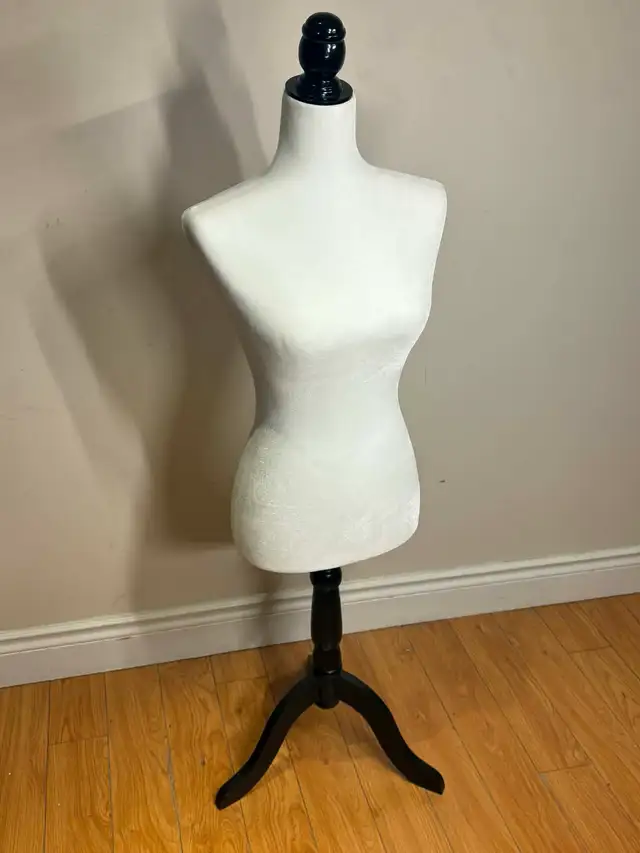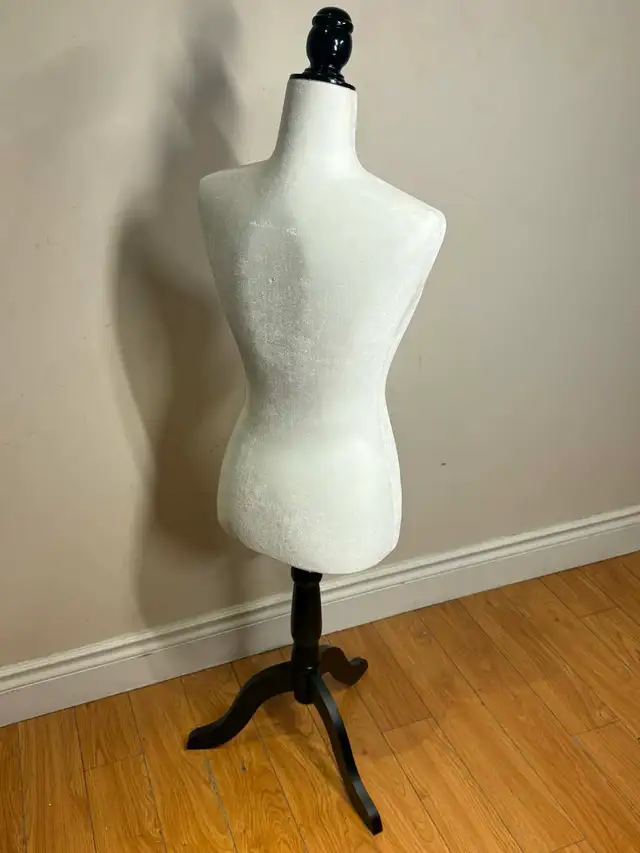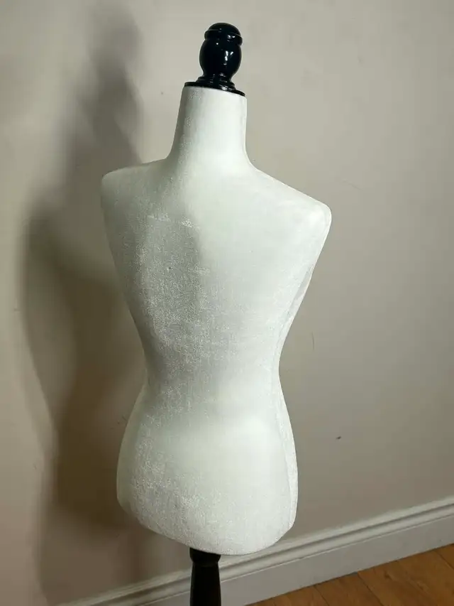 Elegant white dress form mannequin in great condition. Perfect for sewing, tailoring, fashion design, retail displays, or showcasing clothing at home or in a boutique. The clean white fabric body paired with the classic black wooden stand gives it a professional look that fits nicely into any workspace, sewing room, or storefront.