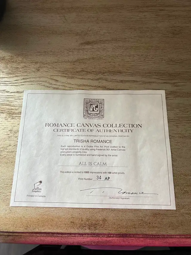 Framed Trisha romance Giclee Canvas for sale. The frame has very little damage on one side not noticeable from the front