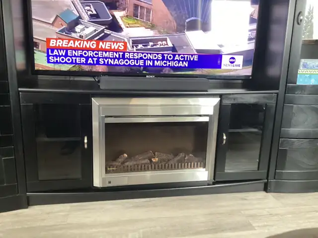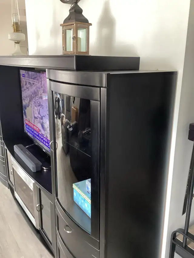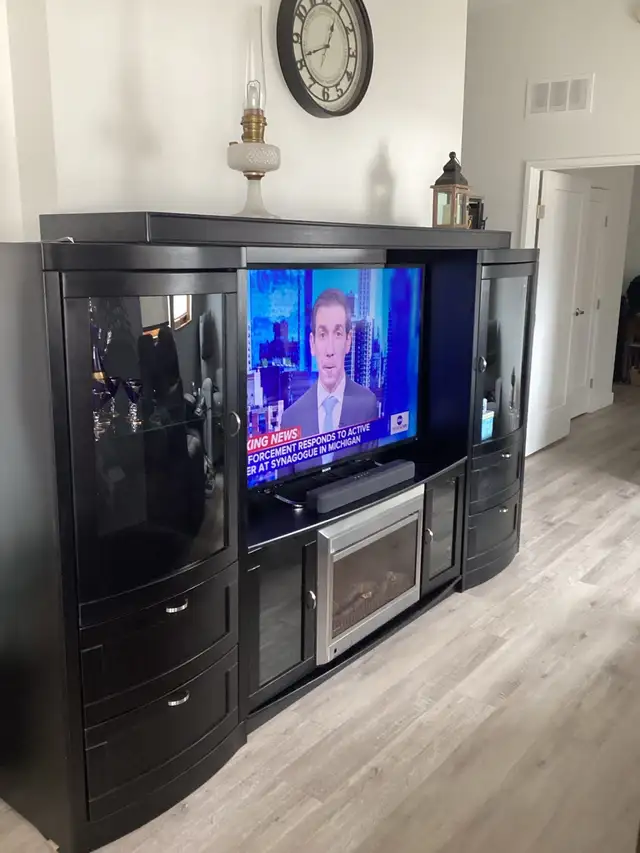 This unit is 18 inches deep x 8 ft 10 inches long x 64 inches high ,in real nice shape ,come with wall switch activated 700 -950-1500 watt muskola electric fire place with lights ,has display lights in bevelled glass doors 4 huge storage drawers ,two two level glass door cabinets , ( t v and sound bar not included ) ,can be taken apart in 4 pieces for moving ,not responsible for moving or pick up , asking $480 o b o , call Gil at 204-347-5531 st malo mb