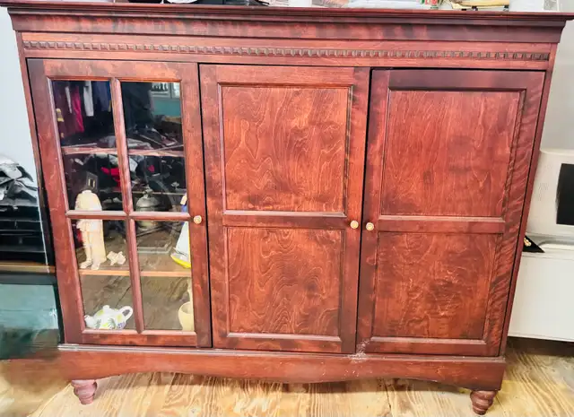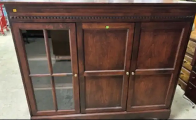 • Caractéristiques : Section gauche avec porte vitrée à 6 carreaux pour exposer vaisselle, objets de collection ou déco ; deux portes pleines à droite pour un rangement discret. Intérieur avec étagères. Poignées en laiton doré et finitions sur le dessus.