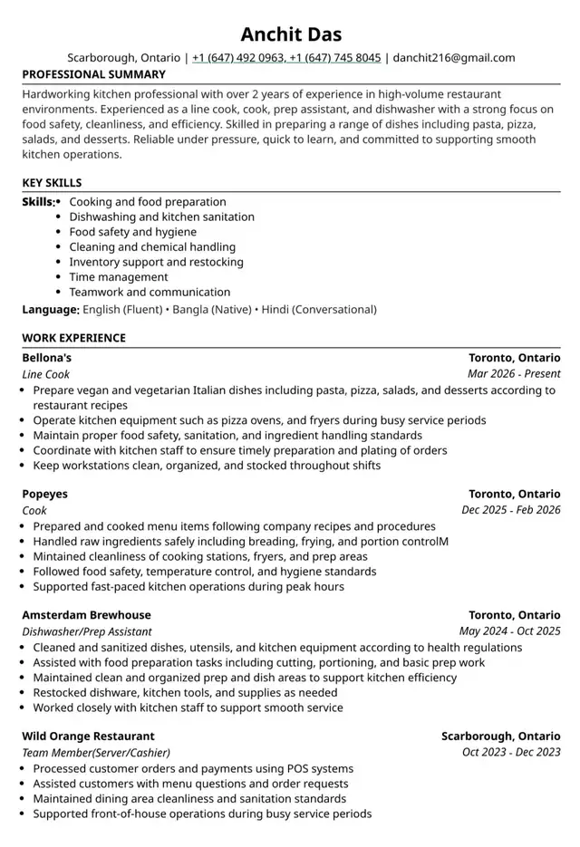I'm an experienced kitchen worker currently working as a line cook in Toronto with over 2 years of restaurant experience including line cooking, prep, and dishwashing.