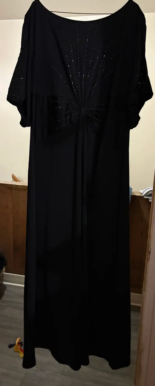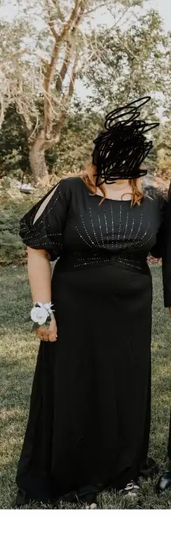 Very pretty very flattering black dress . Size 22. Only worn once to a wedding.