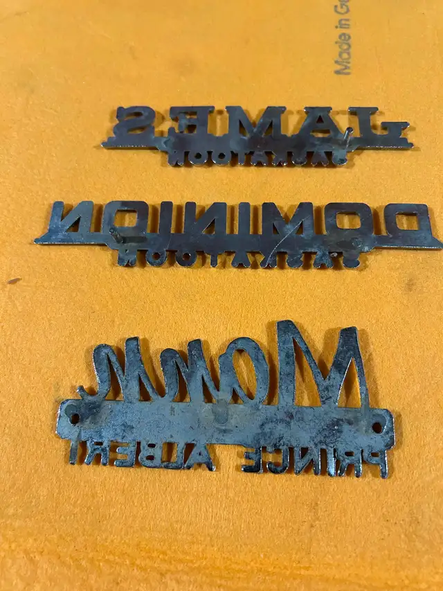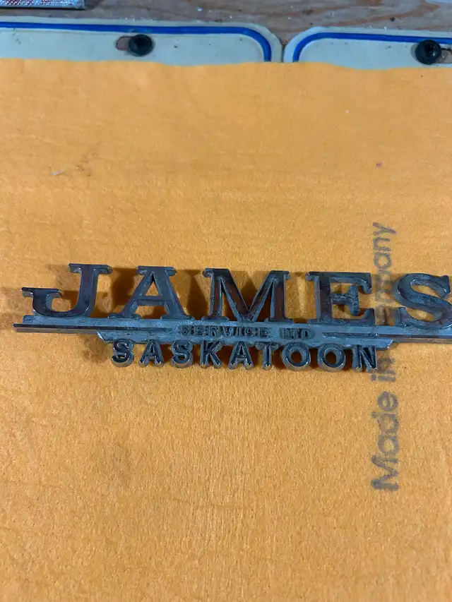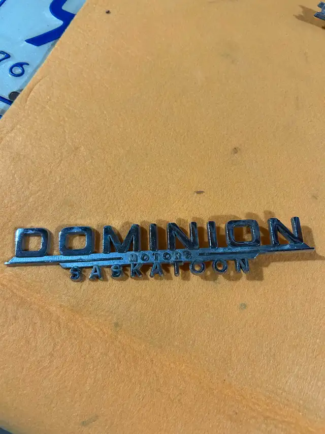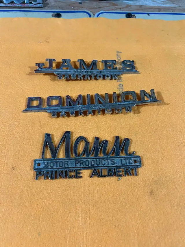 Early car dealership emblems. Not plastic $25 each. Phone or text 306-960-2052