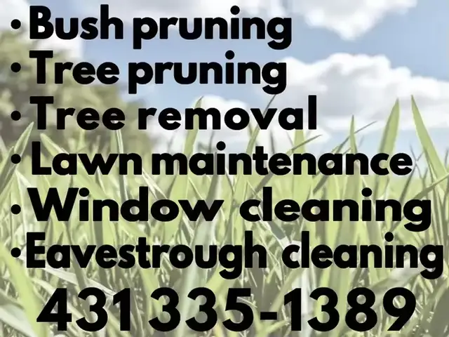 Hi everyone, we provide a number of outdoor services. If you or anyone you know need residential house cleaning, eavestrough cleaning, window cleaning, bush and tree pruning, bush and tree removal, junk removal, permanent light installation, Bouncy castle rental house cleaning. Feel free to send me a direct message on here or send my a text or call at 431 335-1389