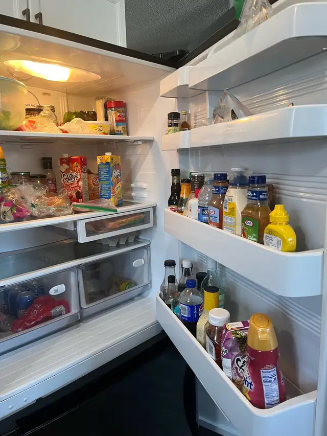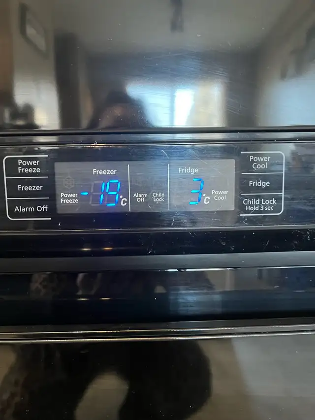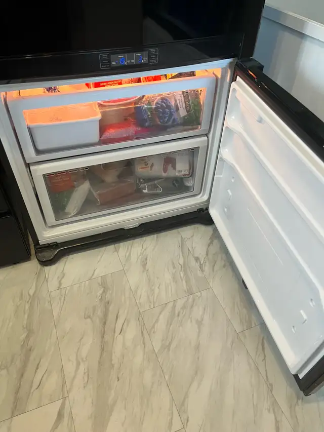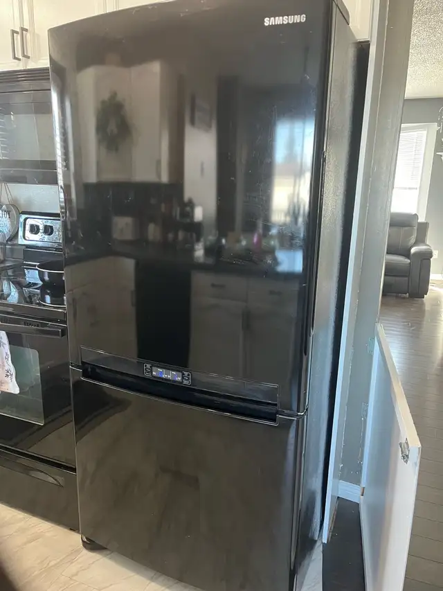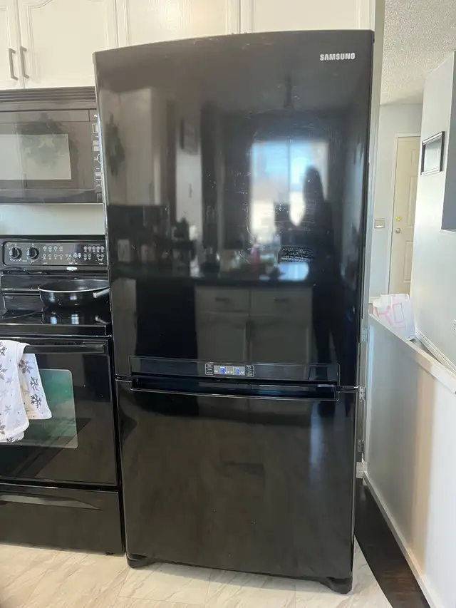 Black Samsung Fridge. 32” wide x 69.6” high. Works good but crispers sometimes fill with a bit of water. One side shelf is cracked. Will have to pickup in Martensville $200 or best offer. Text 306-281-6523 if interested.