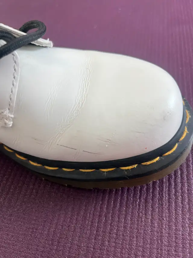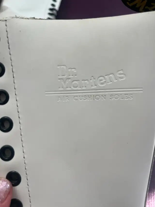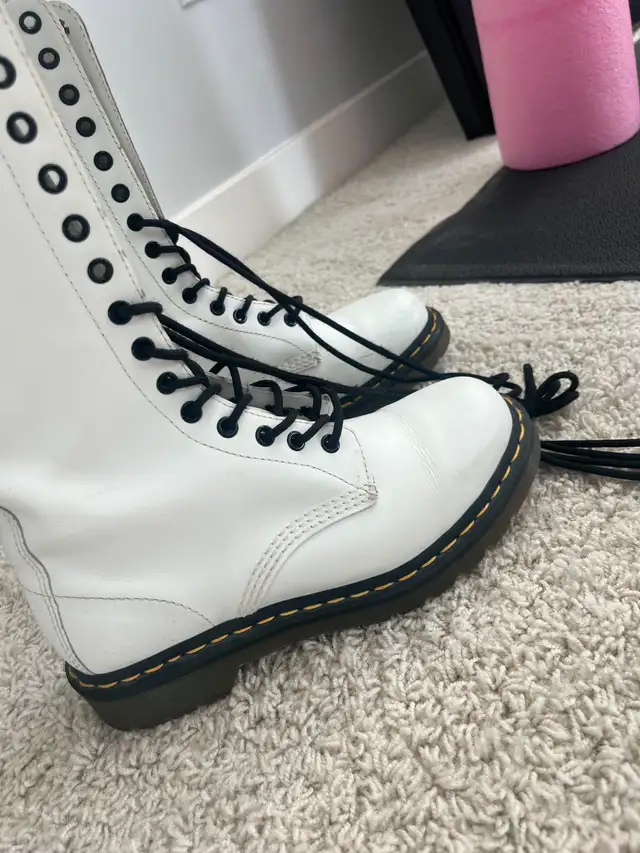Women's size 6 Doc Martens boots. White in color, brand new, never been worn outside. Original AirWair tag and "Oil, Fat, Acid, Petrol, Alkali resistant" stamp on the bottom of the sole. Tall lace up boot with 14 eyelets. Small scuff on the toe of the left boot that is shown in the picture. Please text if interested. 780-920-2912.