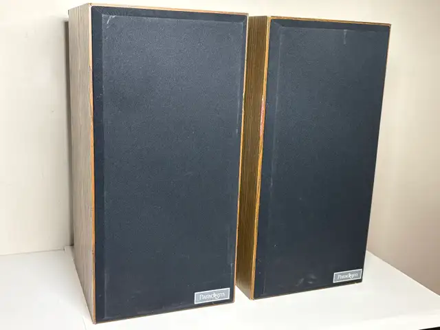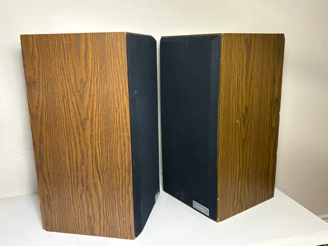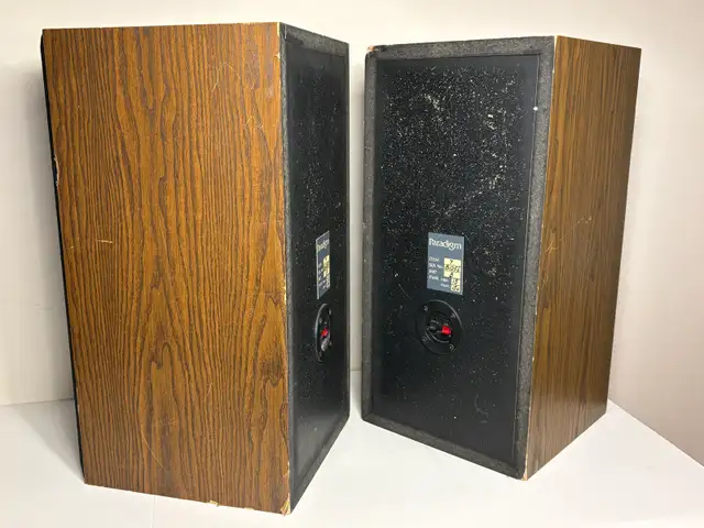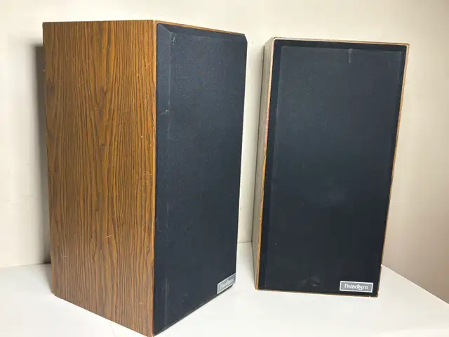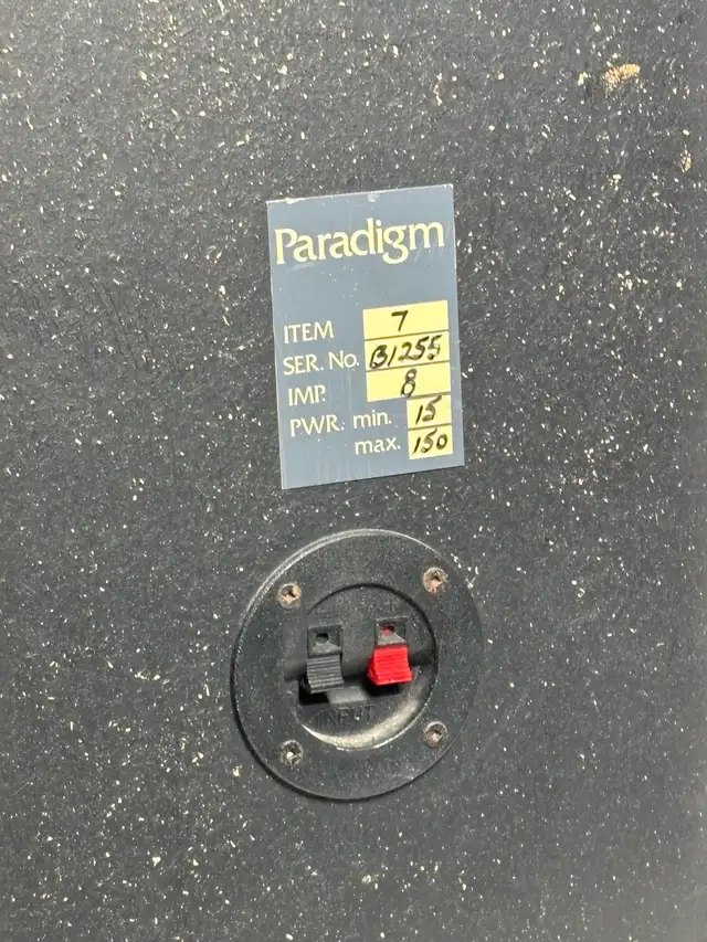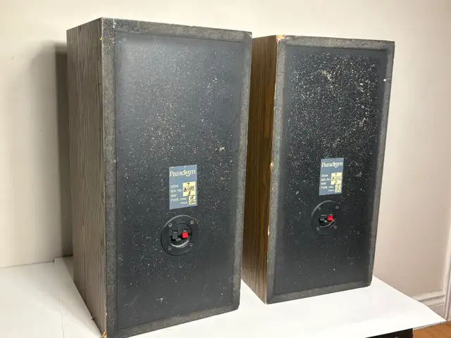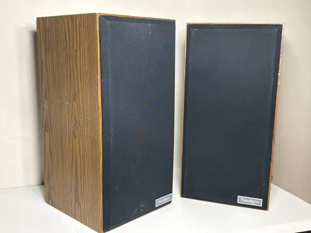 Solid pair of vintage Paradigm bookshelf speakers with a classic woodgrain look.