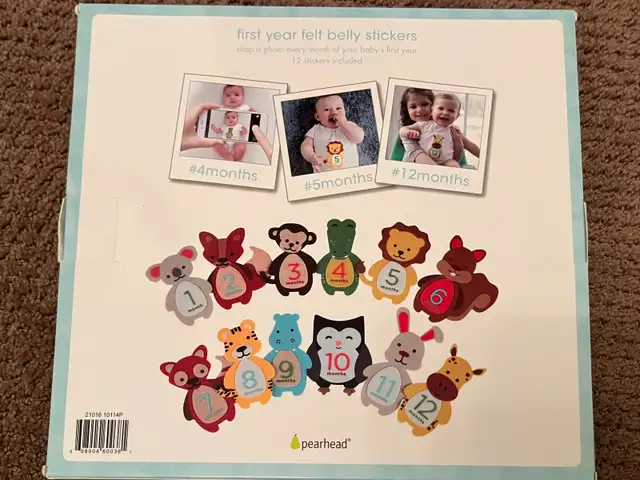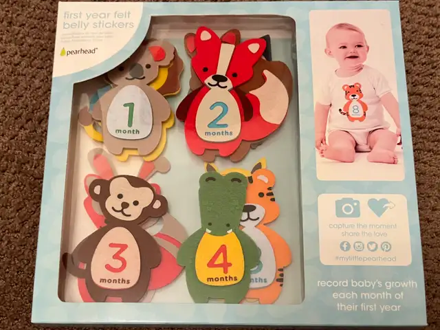 Pearhead First Year Felt Belly Stickers. Brand new in box. $5. Snap a photo every month of your baby's first year. 12 stickers included. Pick up north side by 97 Street and Anthony Henday Drive.