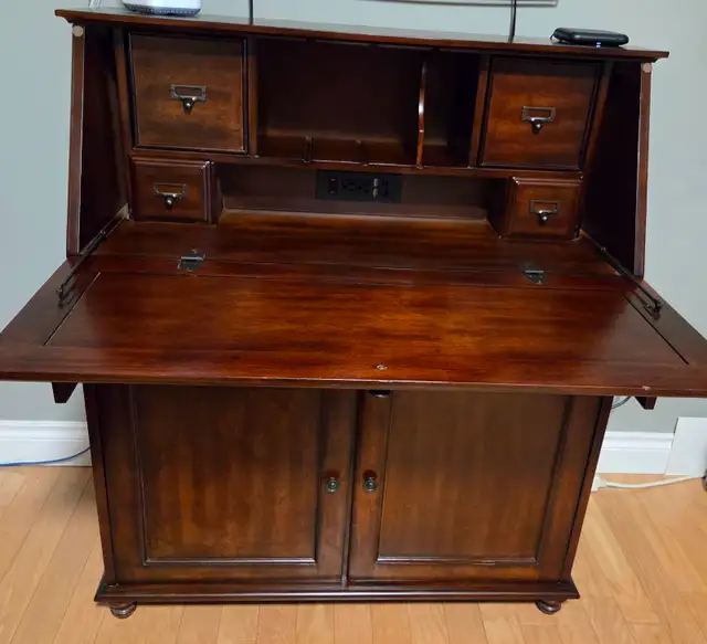 Solid Wood. Fine furniture. Plenty of storage. Factory wired for use with your computer, laptop ETC. Pullout printer shelf. 37.5" wide. Excellent condition. Perfect for small spaces. Pickup in Tuscany. Sacrifice at $350.00. Cash only. 403-239-5906.