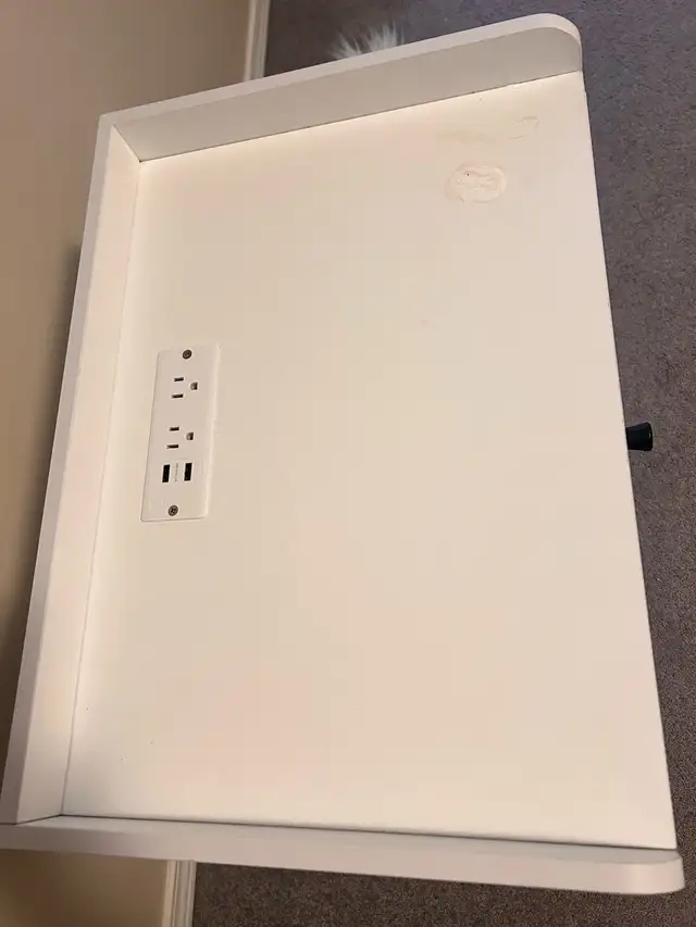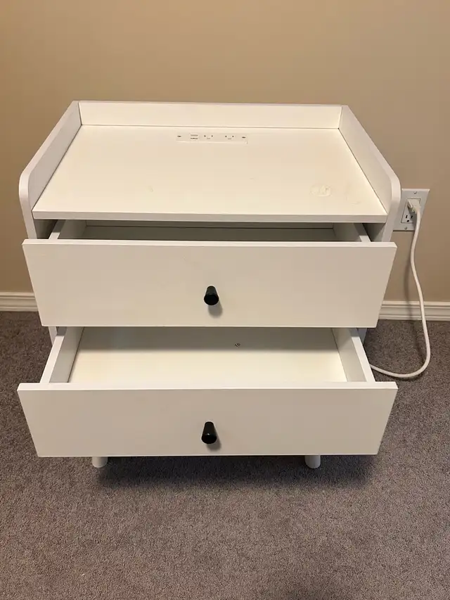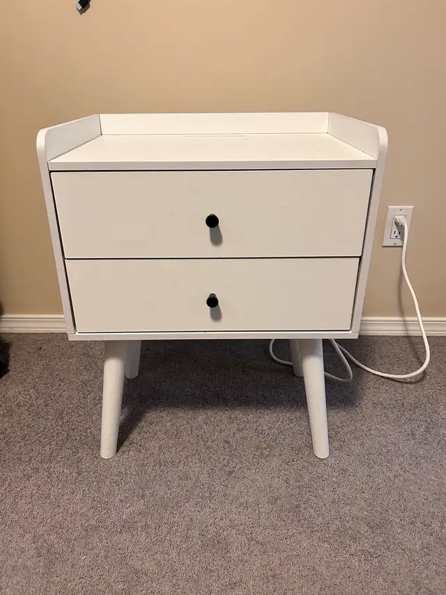 White 2 drawer nightstand/end table with USB and electrical plugs on top.