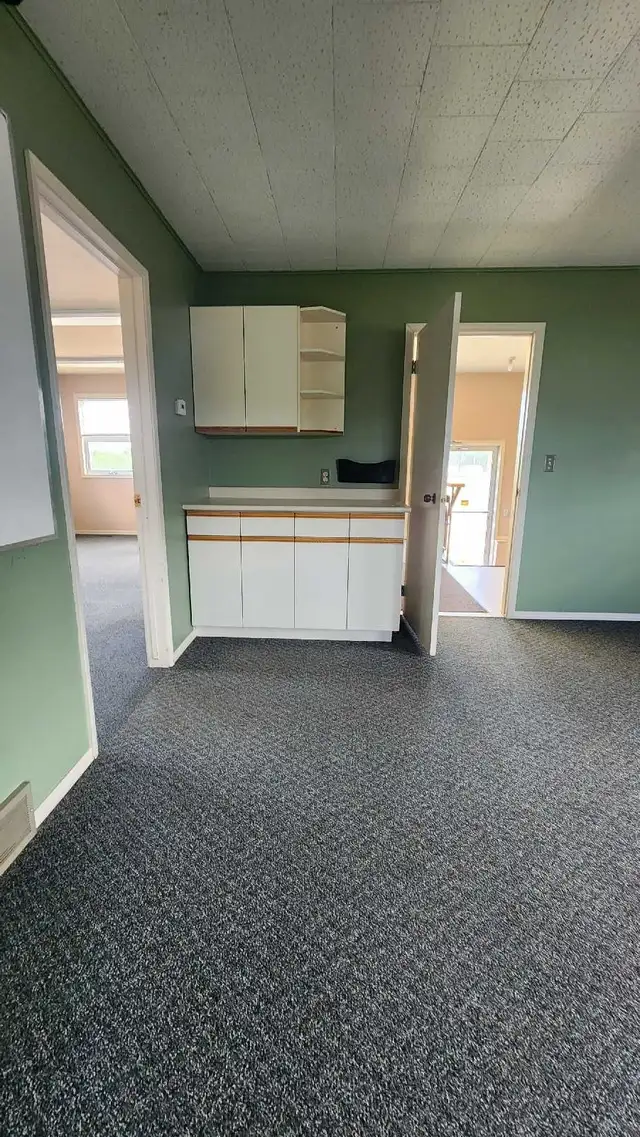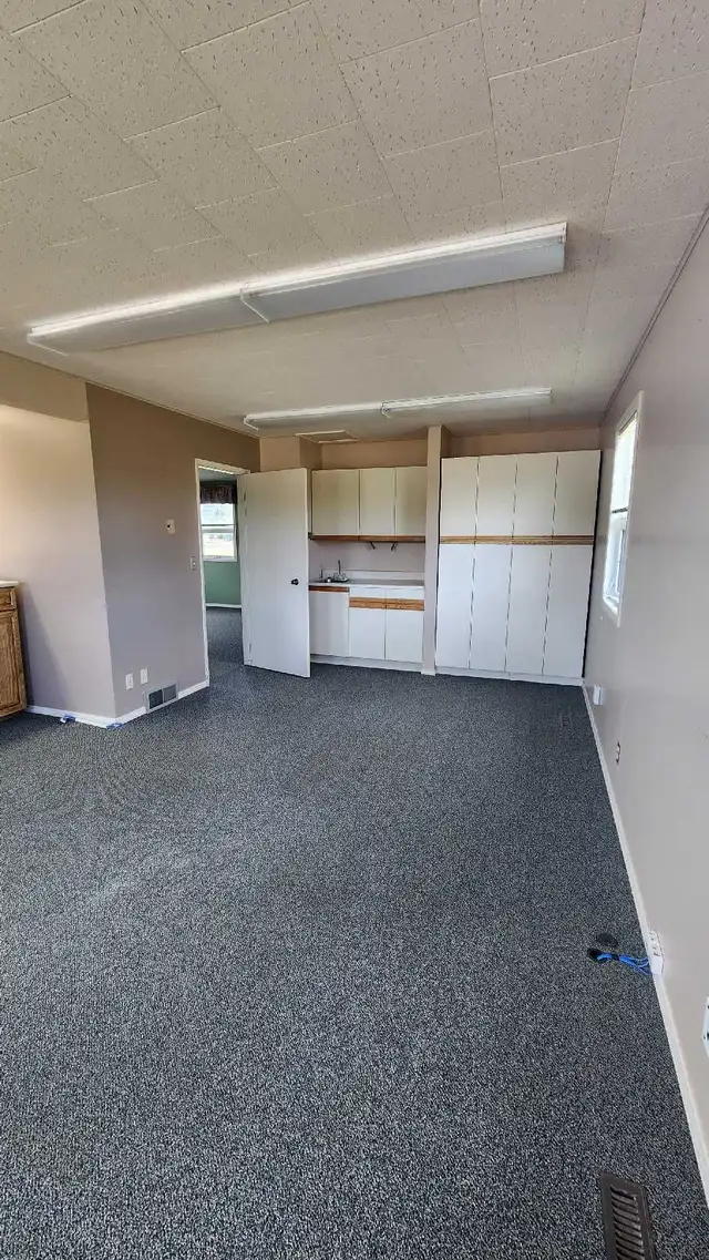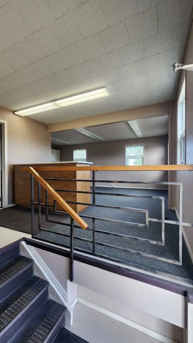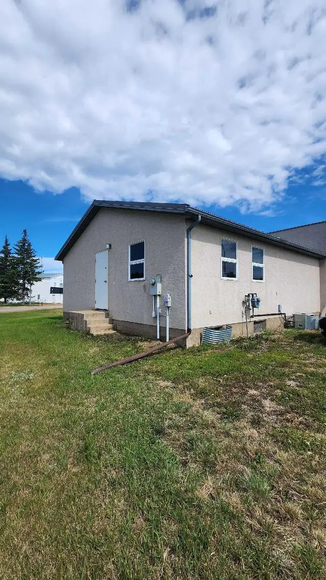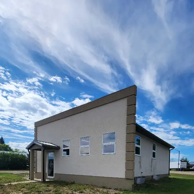 Main floor consists of a reception/open office with a kitchenette. Large office includes a secure vault and seperate rear entrance. Basement includes a 2 piece bathroom, storage shelves, and storage room.