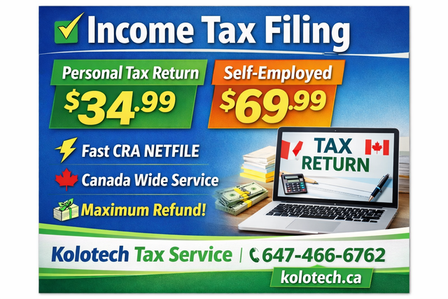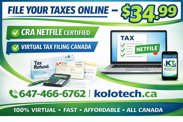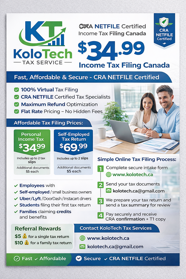 Fast, affordable, and secure online tax filing in Canada with KoloTech Tax Services. We provide CRA NETFILE certified income tax preparation for individuals, students, families, and self-employed professionals across Canada.