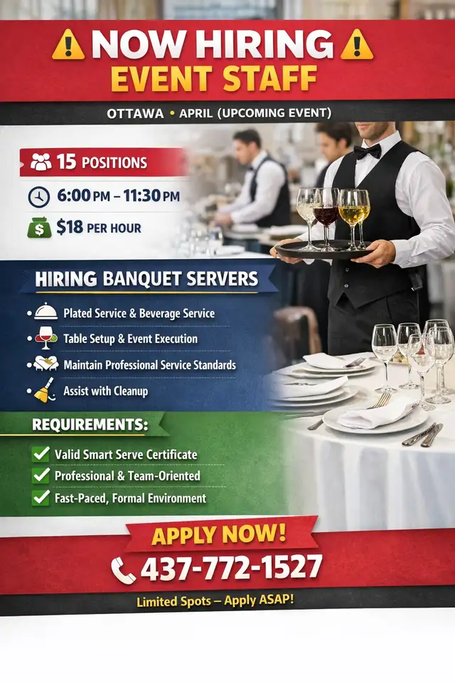 We are currently hiring 15 Event Staff (Banquet Servers) for an upcoming formal event in Ottawa on April 12, 2026. This is a great opportunity for individuals with hospitality experience who thrive in fast-paced, professional environments.