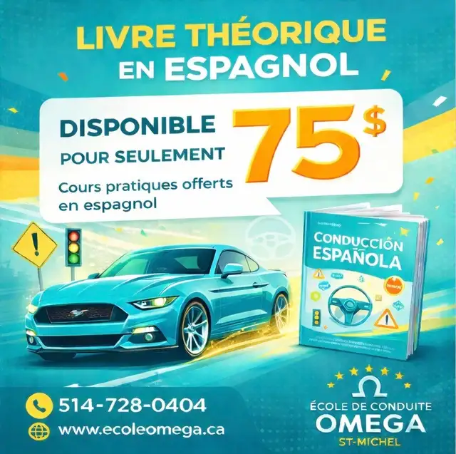 L'école de conduite Omega St-Michel, offre le livre traduit en espagnol pour personnes qui désirent étudier pour l'examen théorique à la SAAQ. Il s'agit d'un livre en couleur qui inclut toute la matière nécessaire pour réussir l'examen du premier coup !