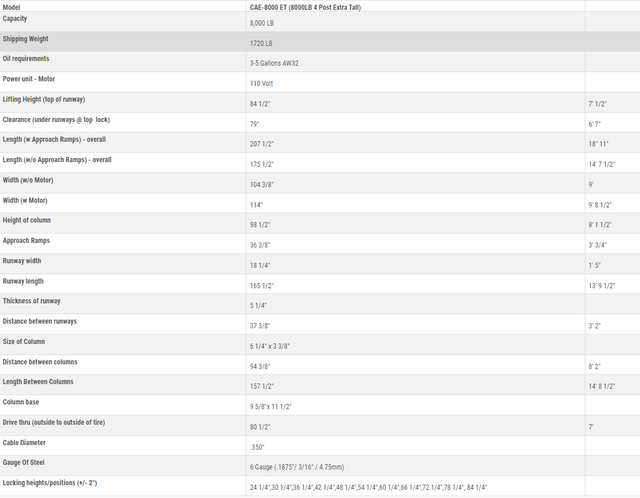 This CAE-8000ET 4 post lift also includes 4pcs. drip trays and approach ramps. Please ask about other optional accessories that are available for this lift.