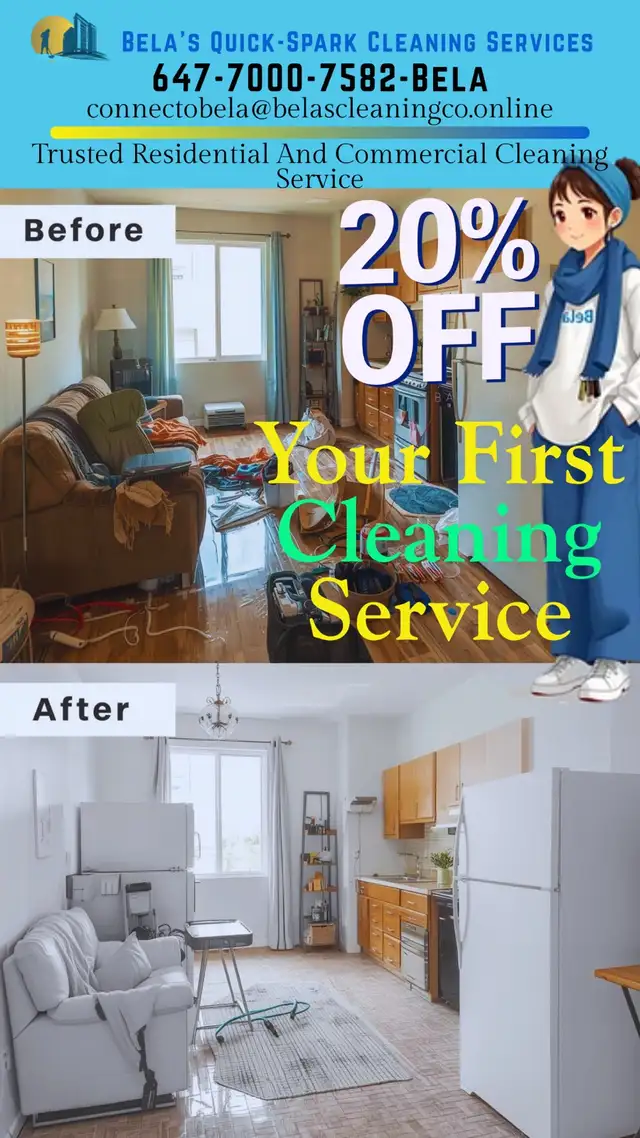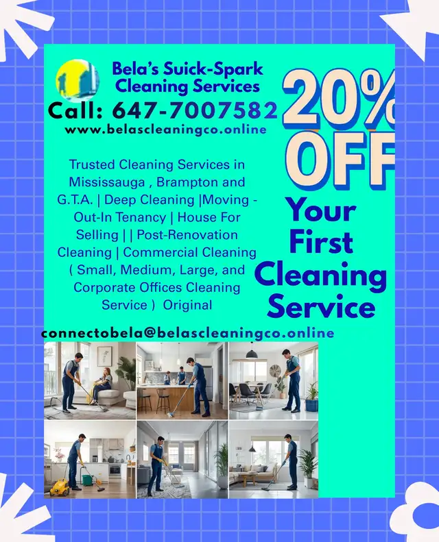 Bela's Quick-Spark Cleaning Services provides trusted residential and commercial cleaning for homes, condos, apartments, and offices in Forest Hill, Mississauga, Brampton, Midtown Toronto, and nearby cities ✨ We handle deep cleaning, sanitizing, dusting, vacuuming, mopping, and move-in/out cleaning with fast, reliable service Contact today for affordable cleaning that keeps your space spotless and stress-free More-info:647-700-7582 or connectobela@belascleaningco.online .Book Now !!Limited Time Offer!
