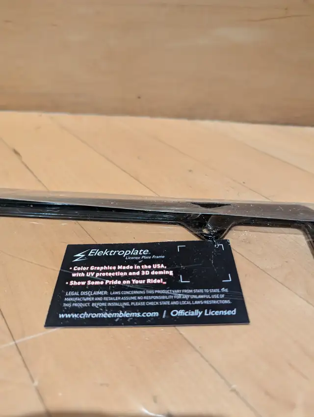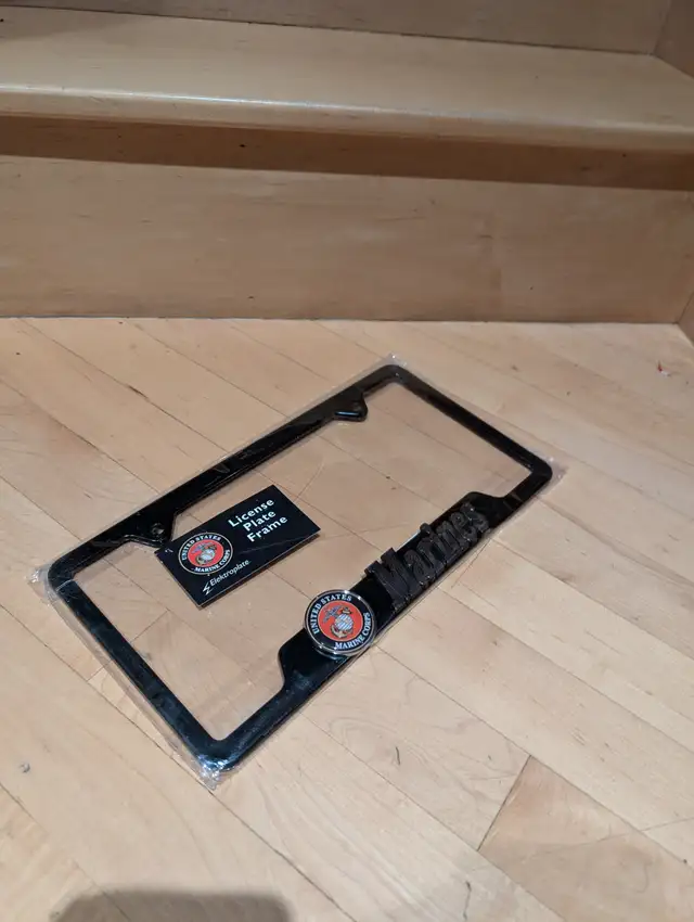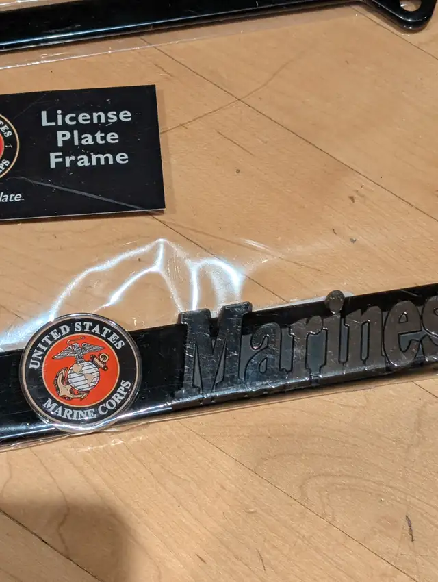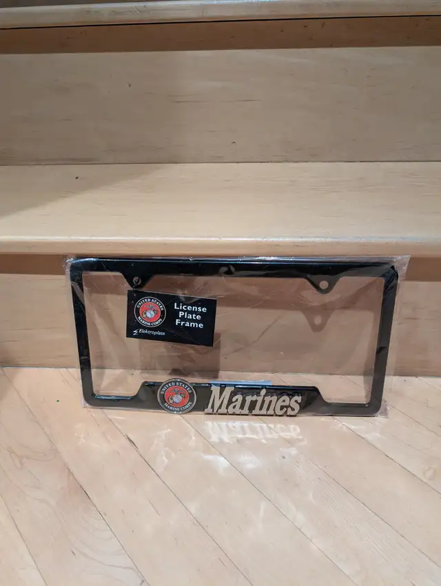 Today I offer for your inspection this premium quality metal licence plate protector, made in the U.S.A. This excellent plate cover is simply in immaculate condition and comes sealed in plastic with no discernable wear whatsoever. The plate protector features a the U.S. Marine Corps logo, bursting with bright, vivid colours along with the word Marines in Chrome beside it. It is an electroplated black steel frame with UV protection and 3D doming