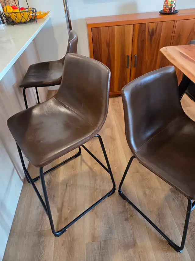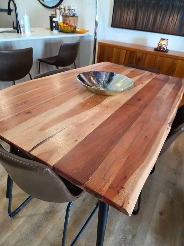 Acacia Wood Dining Table and Chairs with Matching Counter Stools. Nice Dining Set. Clean home and non smoking. Pickup is Niverville, Manitoba. Text 431-388-0626