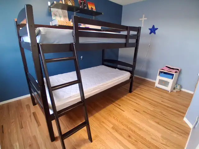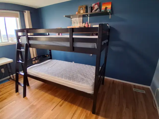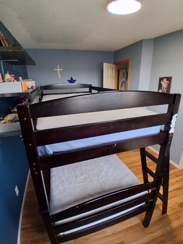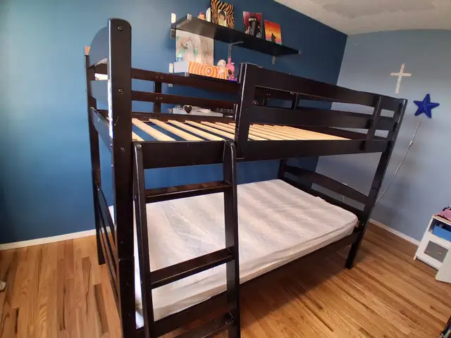 My children have outgrown the bunk bed, so now it's up for sale. It can be stacked or stand-alone ie. separated. Standard size for each bed (same dimension of width and length). It comes with two mattresses and a ladder. If interested, pls text me at my phone or email me at xenergy2004@yahoo.com
