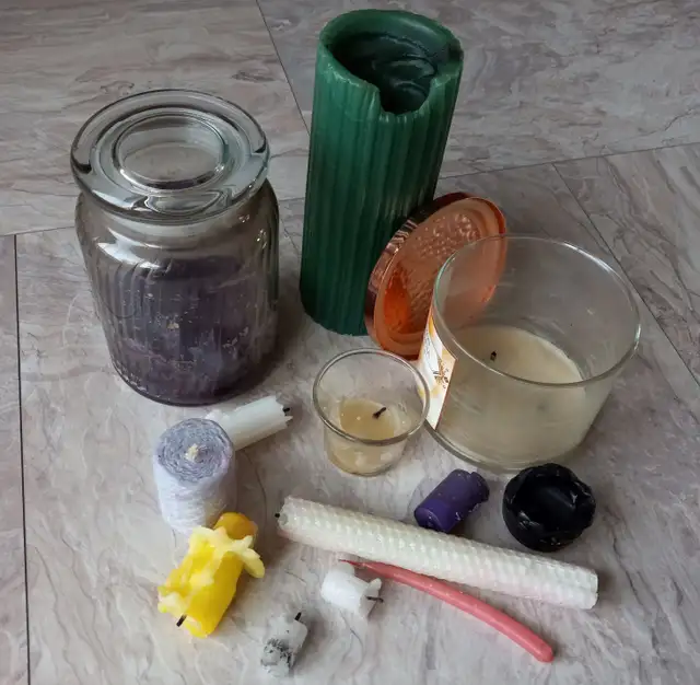 Broken taper candles and stubs, half used or empty tea lights, jar candles, uneven pillars, votive candles, decorative candles, ceremonial candles etc. Any old scented warmer wax, therapeutic wax, unwanted wax. All wax melted, strained, cleaned and reused. Metals, glass and plastics cleaned and recycled - Tea lights take 100's of years to break down.