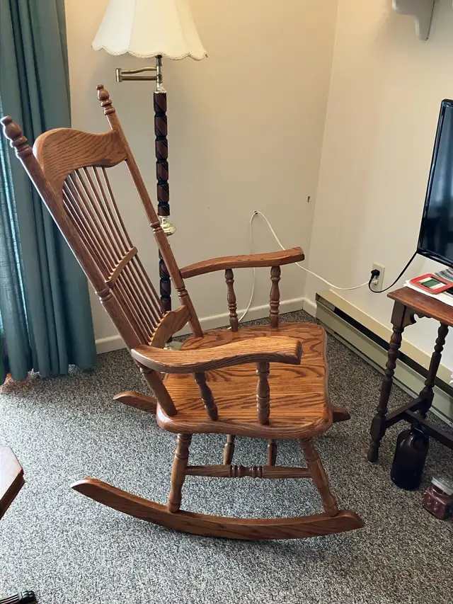 Add a touch of timeless charm to your home with this used rocking chair, featuring a sturdy wooden construction and a classic design. It's perfect for relaxing evenings by the fireplace or soothing a little one to sleep.