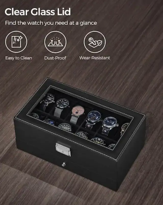 • Large Glass Display Lid – Easily view your watches while keeping them dust-free