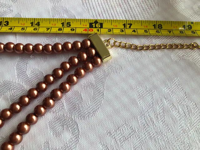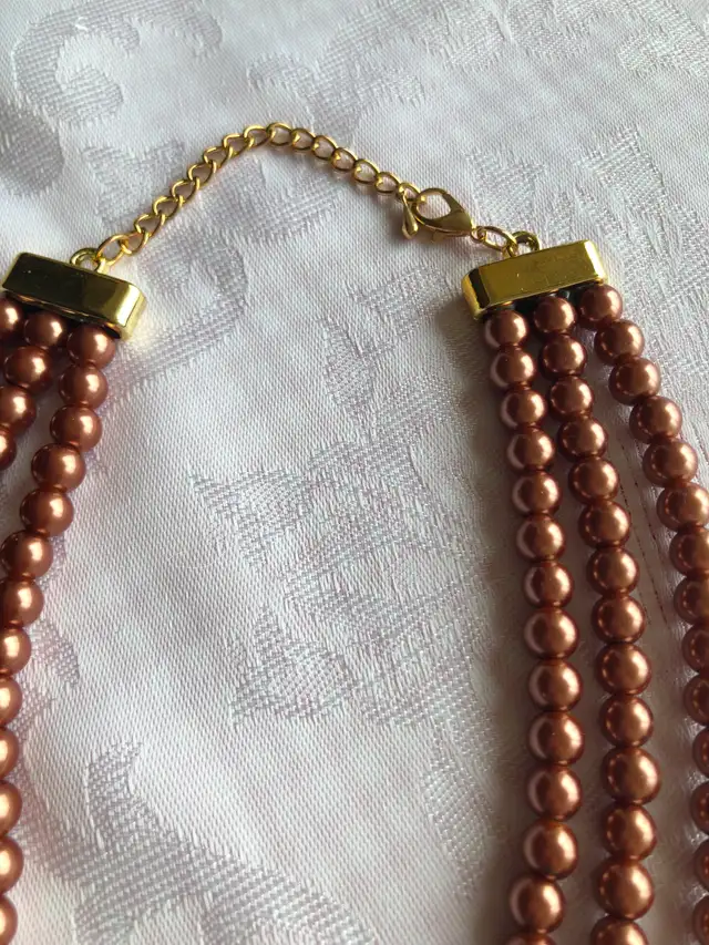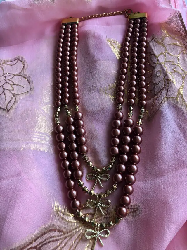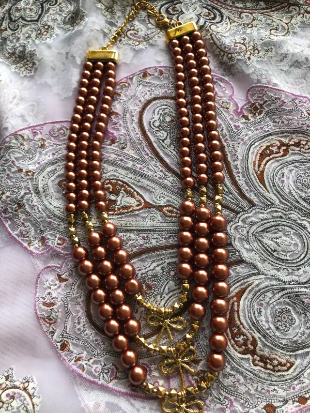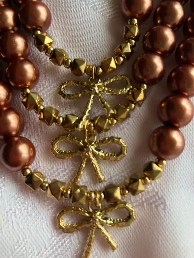 Three strands of large faux pearls in light brown/cinnamon colour, which also include gold toned beads and three small stylish bows.