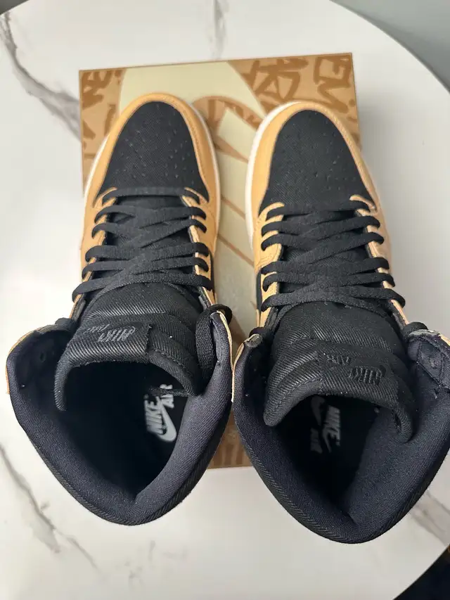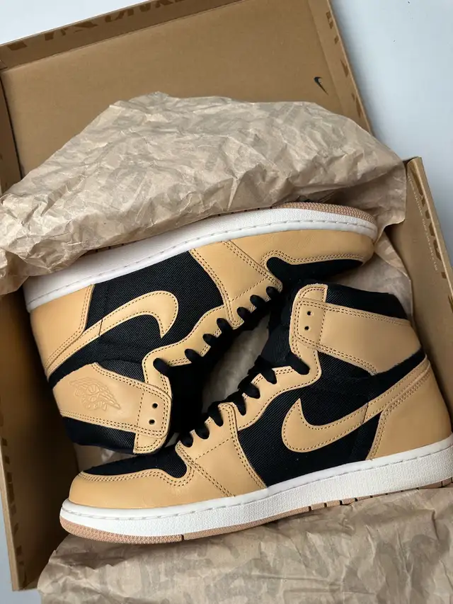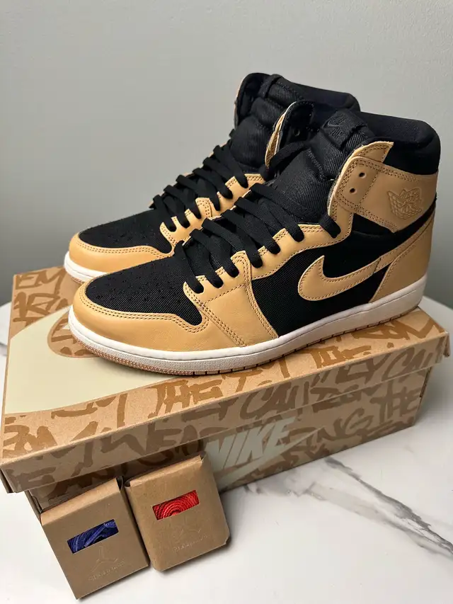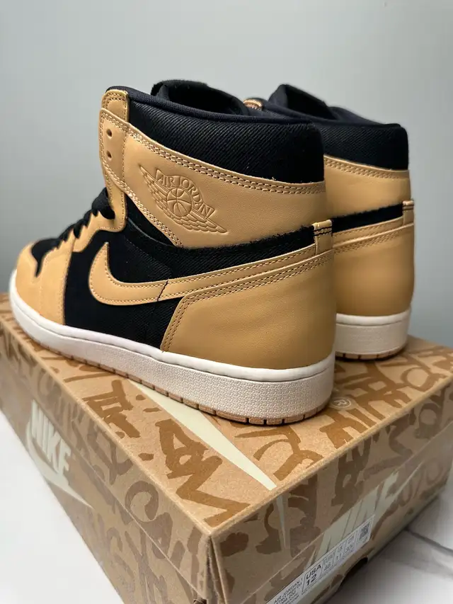 • Key Features: Premium Vachetta Tan leather overlays with a black twill (denim) base. Features an embossed Wings logo, tonal Nike Air branding on the tongue, and a classic sail-colored midsole.