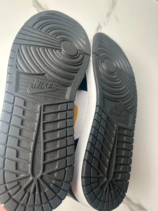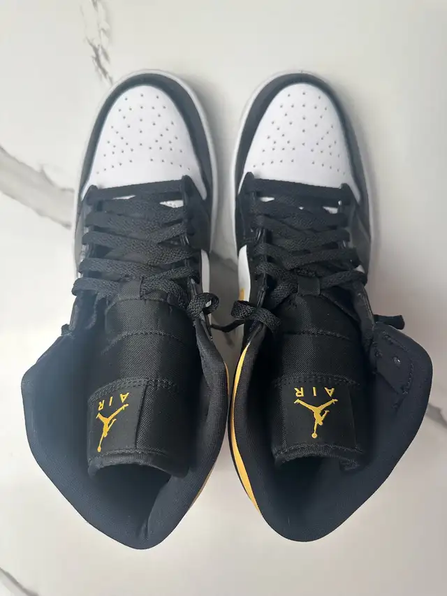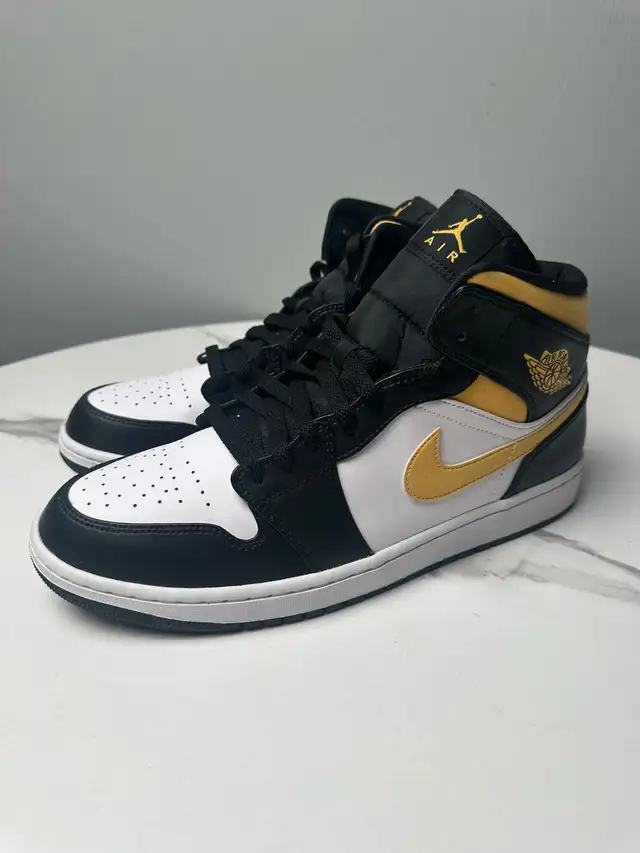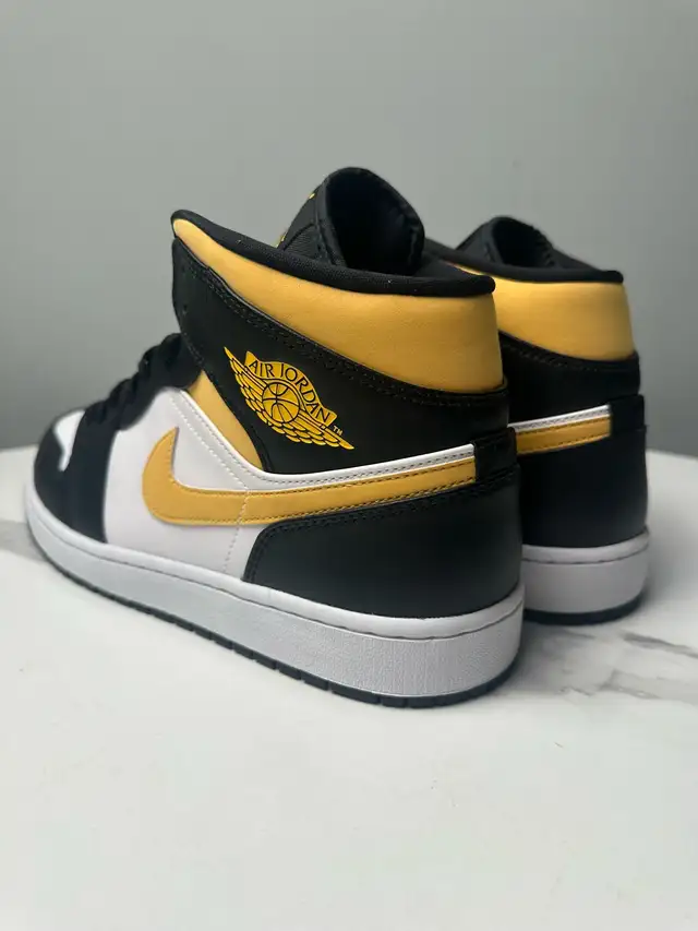 • Key Features: Premium white and black leather upper with "Pollen" yellow accents on the Swoosh, collar, and Jumpman branding. Classic Air-Sole unit for lightweight cushioning.