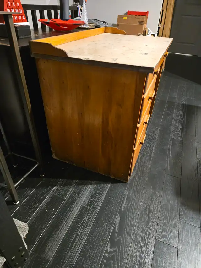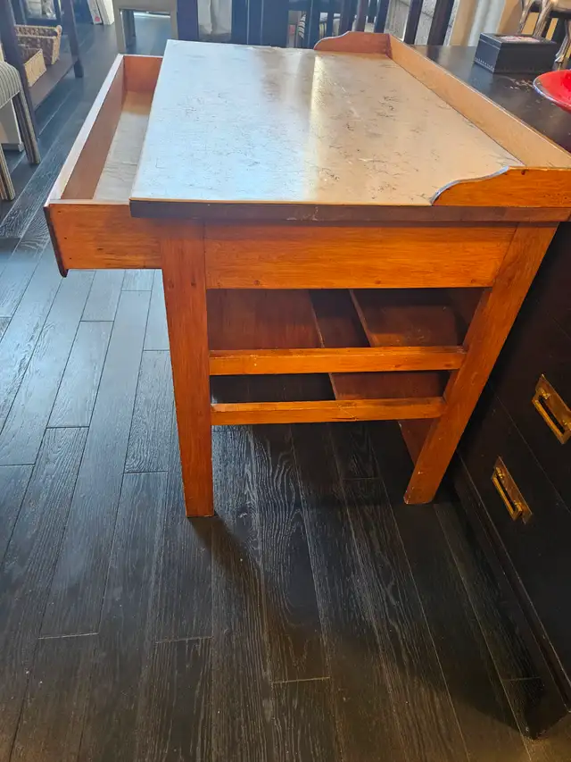 Linoleum top. Solid wood well built. Large drawers. Underside shelf. Rear top guard.