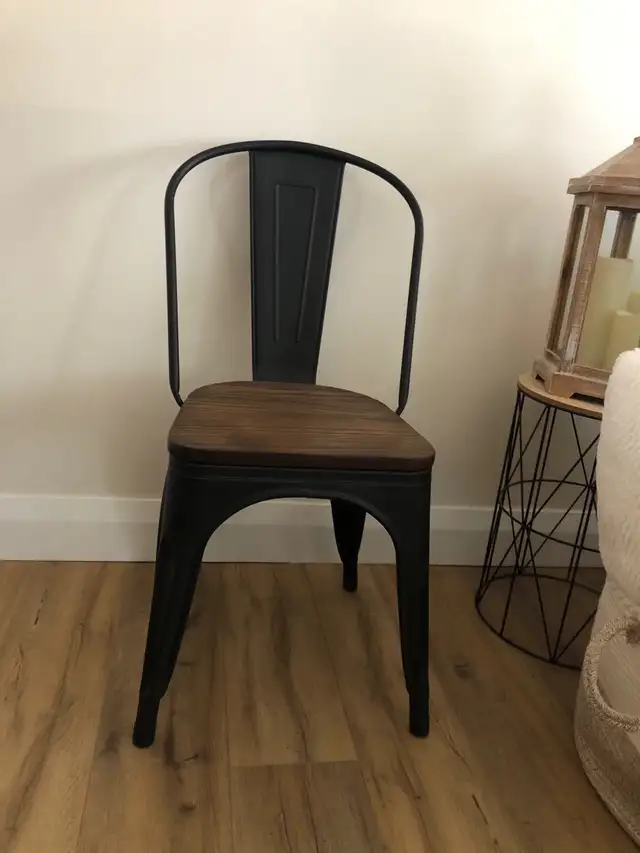 4 black metal and dark brown wood chairs. All in good shape. $60 for all 4. Please text Jen @ 226-750-9981
