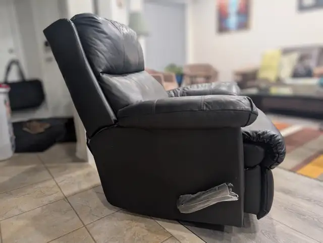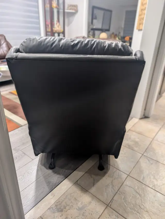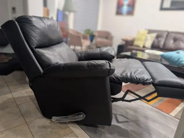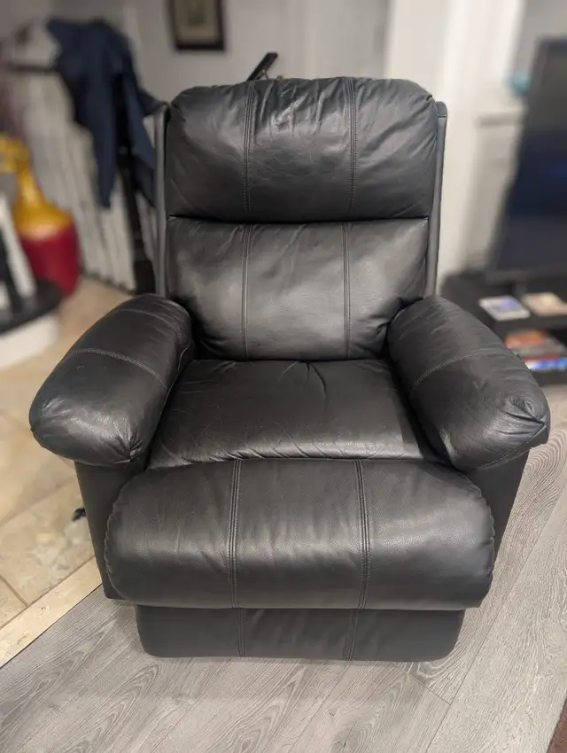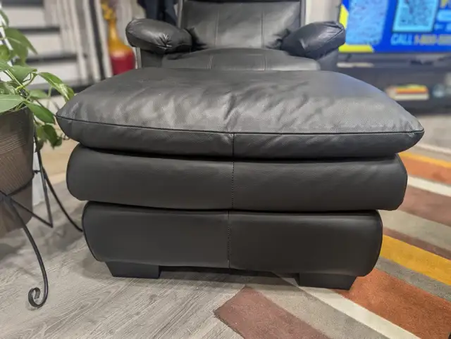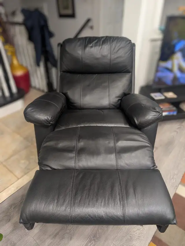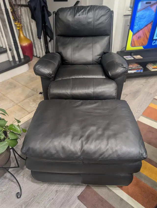 Comfortable and stylish black leather recliner with matching ottoman. Lightly used, very well maintained, and no damage. Perfect for a living room, office, or reading corner.