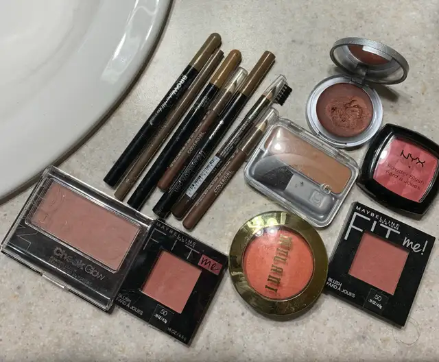 Various brown brow pencils and powdered blushes and one cream glitter shadow for FREE! Barely used… if used at all!