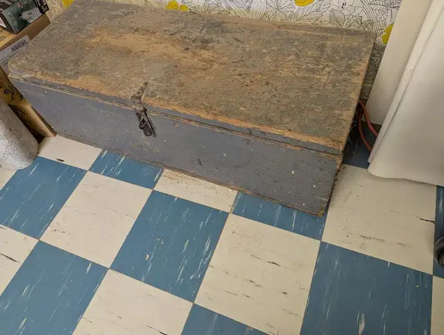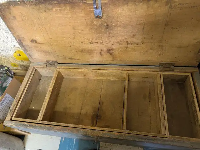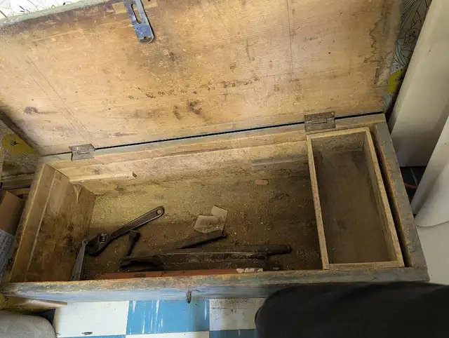 I am selling my Dad's very old tool box. It is made of wood and is strong enough to stand on. It has three removable trays on top and a big area in the bottom. Dimensions are L34" x W14" x H11". The lid is hinged and has a hasp for locking. Handles on both ends for carrying.