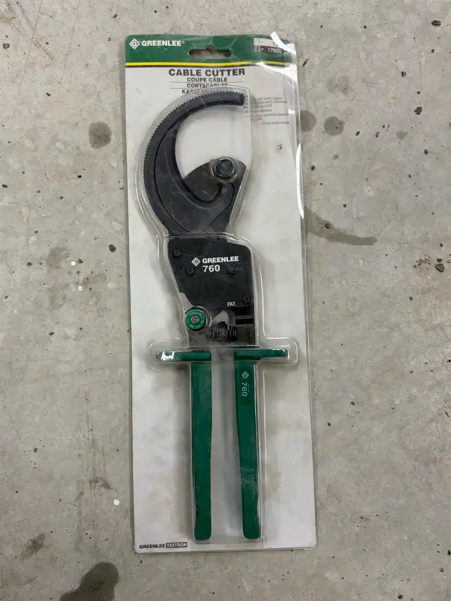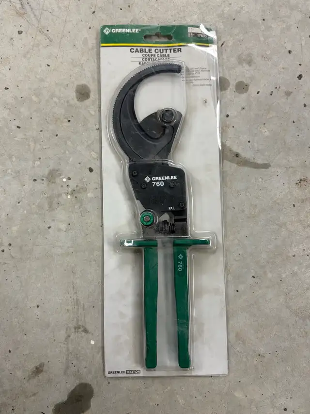 New Greenlee #760 compact ratchet cable cutter is designed to cut up to 1000mcm copper and aluminum cables with ease, offering a clean and efficient cut every time. The ratchet mechanism ensures minimal effort, making it perfect for professional electricians and DIY enthusiasts alike. This tool is brand new, still in its original packaging, ready to tackle any cabling project.