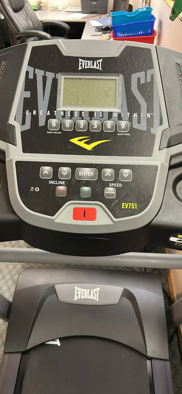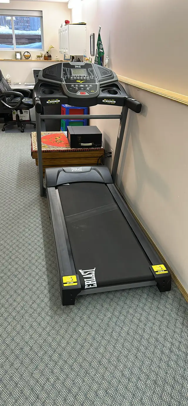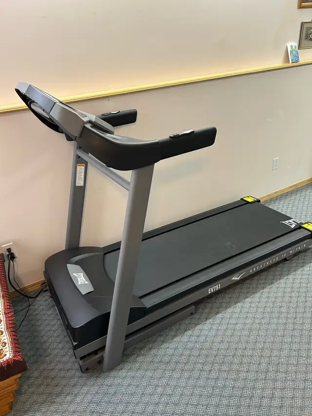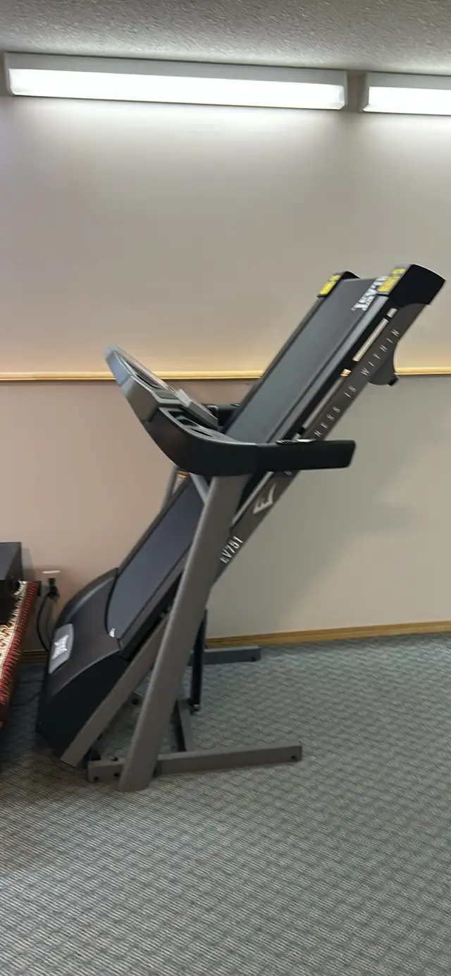 Treadmill in new condition. Model No. 16005607510. This fitness treadmill was purchased by the owner. Programable features with Speed and Incline buttons on the handles. Easy folds for storage.