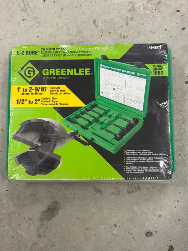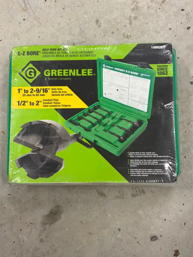 New Greenlee #149H2KIT E-Z bore self-feed bit set, perfect for creating precise holes ranging from 1 inch to 2-9/16 inches. This set is designed for use with conduit and pipe, ensuring clean and smooth cuts every time.
