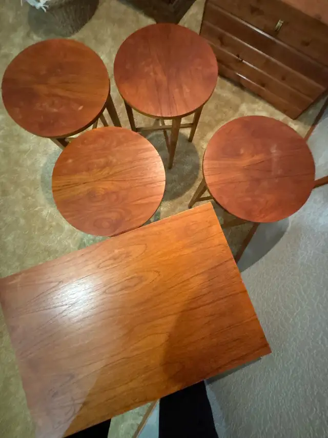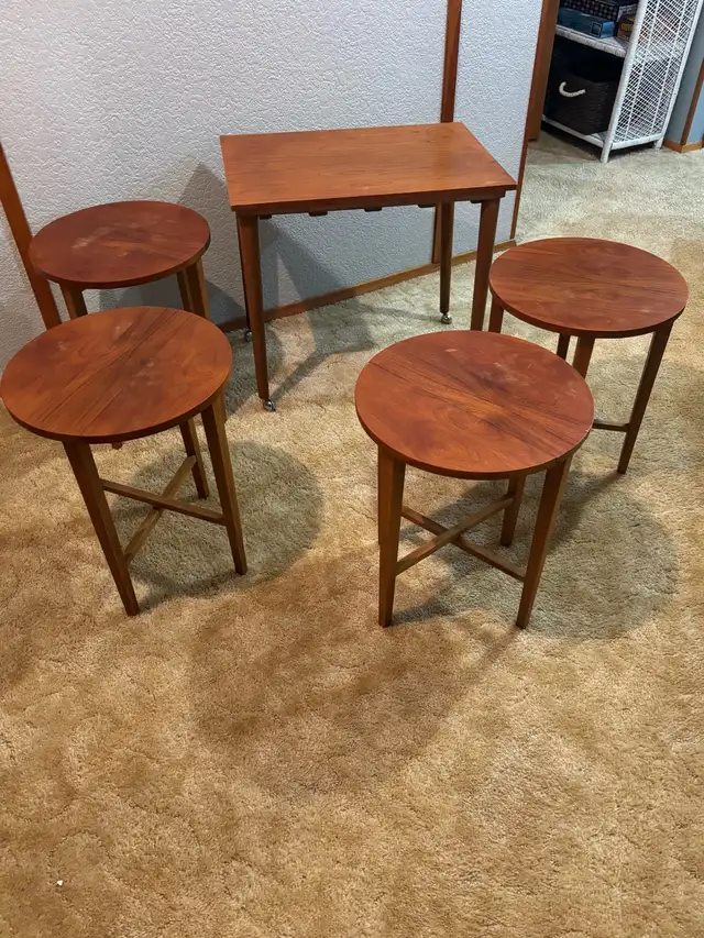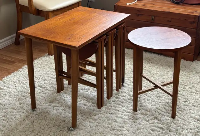 Beautiful Poul Hudevad style retro danish nest table house 4 drop leaf tables that neatly fold up and slide in.