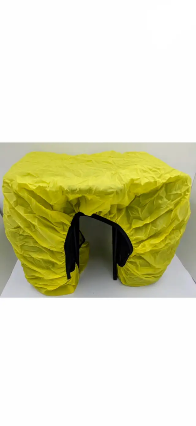 Made of weather resistant Cordura material and includes a yellow rain cover.