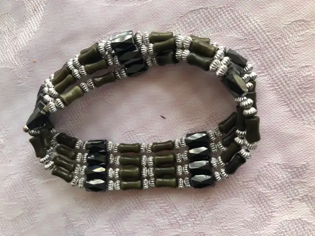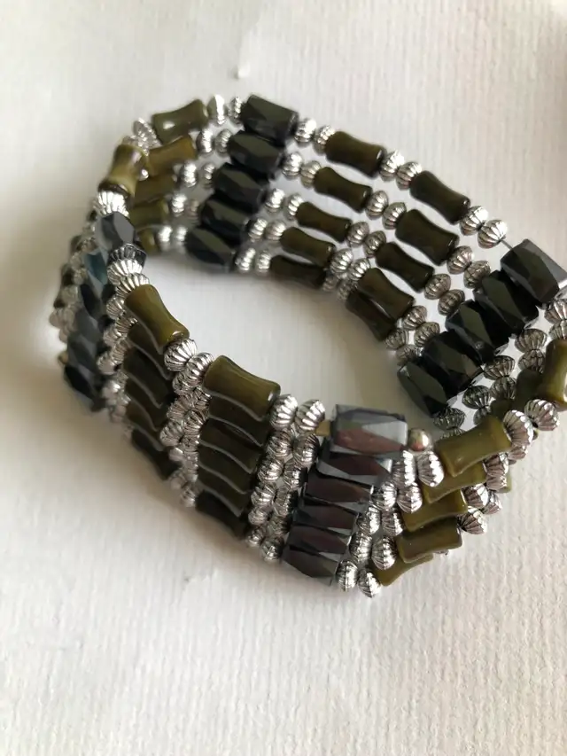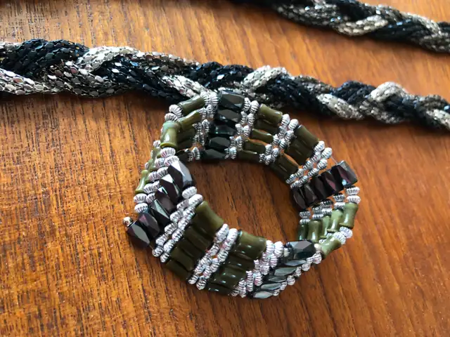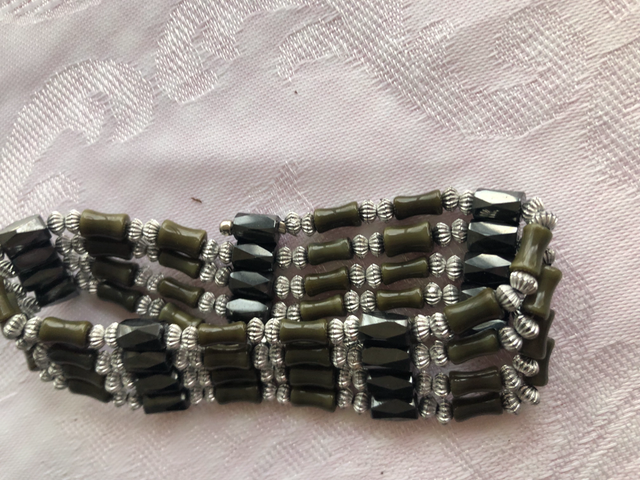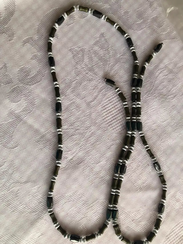 • 35” long , made of silver and metallic beads.