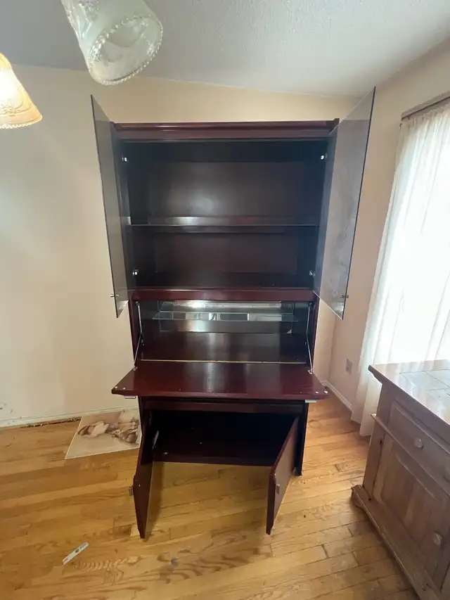This used secretary desk features a hutch with glass doors and shelves. It has a fold-down writing surface and storage compartments below. The dark wood finish adds a touch of elegance to any room.
