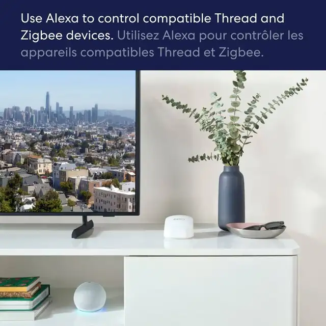 Built-in smart home hub - eero 6 contains a smart home hub to connect compatible Thread and Zigbee devices on your network with Alexa, replacing the need to buy separate hubs.
